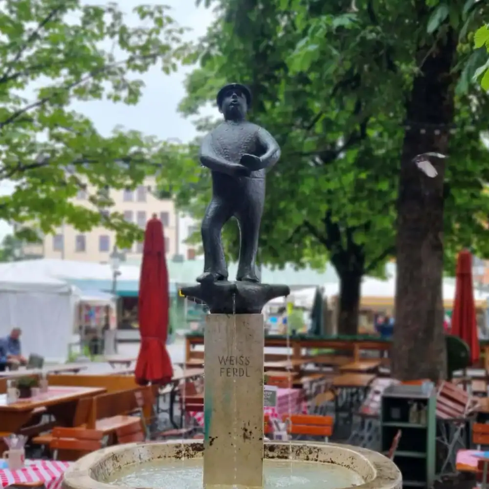 Der Biergarten wurde erst 1970 im Herzen des Marktes errichtet, damals noch unter den frisch gepflanzten Kastanien. Heute kann man sich an einem schönen Sommertag im Schatten der Kastanien ausruhen und auch vor einem kurzen Regenschauer schützen die Bäume mittlerweile. Seit der Eröffnung ist er ein beliebter Treffpunkt für alle Münchner und Touristen, die sich mit Blick auf den Maibaum und den plätschernden Weiß-Ferdl-Brunnen erholen und sich das Bier schmecken lassen. Gerade in der Mittagszeit und am Samstag ist der Biergarten gut besucht.