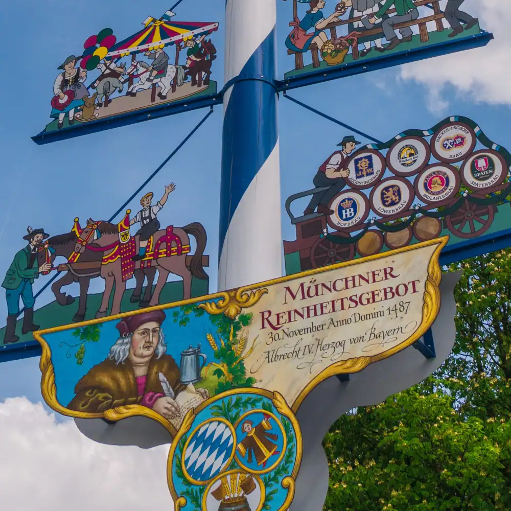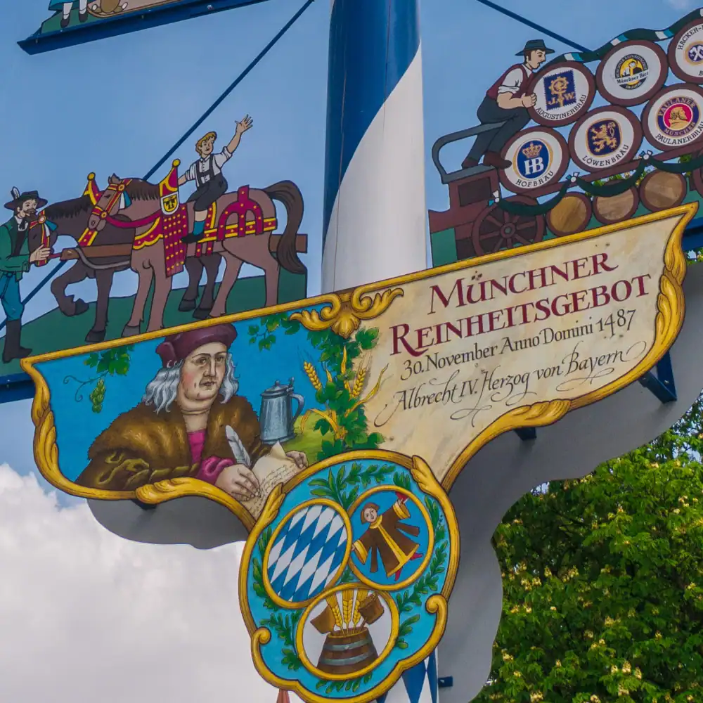 Am Fuße des Maibaums hat das Münchner Reinheitsgebot, unterzeichnet von Herzog Albrecht IV. von Bayern (1447-1508) am 30. November 1487, seinen Ehrenplatz gefunden. Es symbolisiert das unerschütterliche Bekenntnis der Münchner Brauereien zur höchsten Braukunst und erinnert daran, dass in München bereits im späten Mittelalter streng auf die Zutaten des „flüssigen Goldes” geachtet wurde.