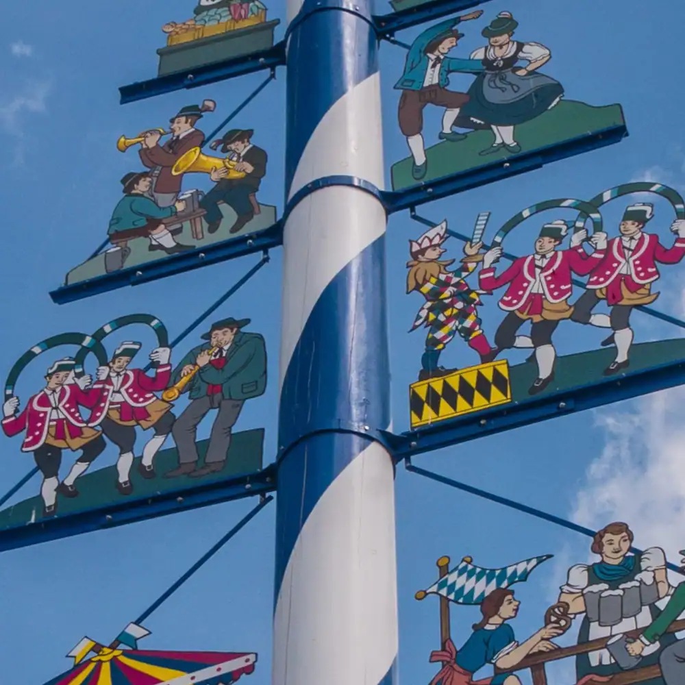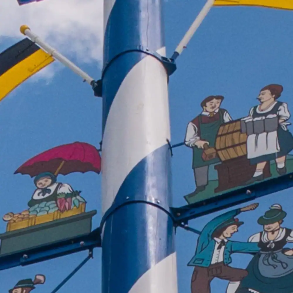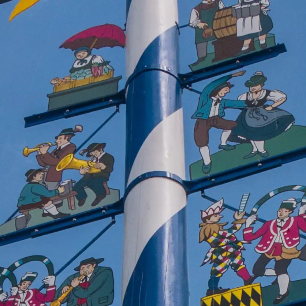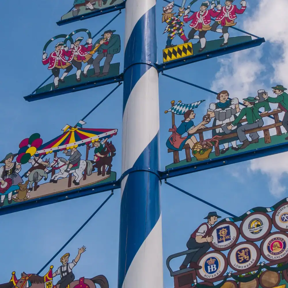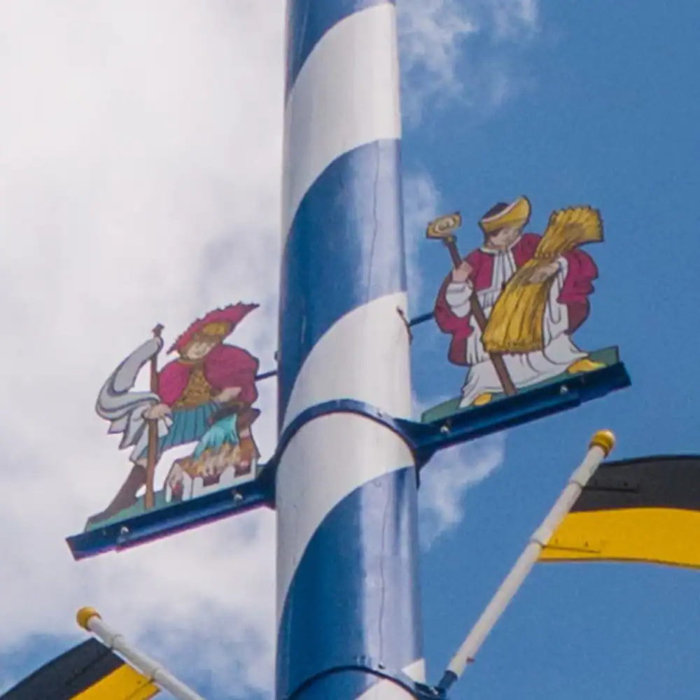 Der Maibaum am Viktualienmarkt spiegelt die Münchner Lebensart wider. Seine sechs Figurengruppen, die 1992 vom Illustrator Paul Ernst Rattelmüller entworfen und von Arno von Lossow kunstvoll bemalt wurden, zeigen die Wahrzeichen der Stadt. Ergänzt wird das Ensemble durch eine Tafel von Tita E. Gronemeyer, die sie zum 525-jährigen Jubiläum des Reinheitsgebots im Jahr 2012 gestaltete. Doch welche Symbole verbergen sich im Detail eigentlich hinter den Figuren?